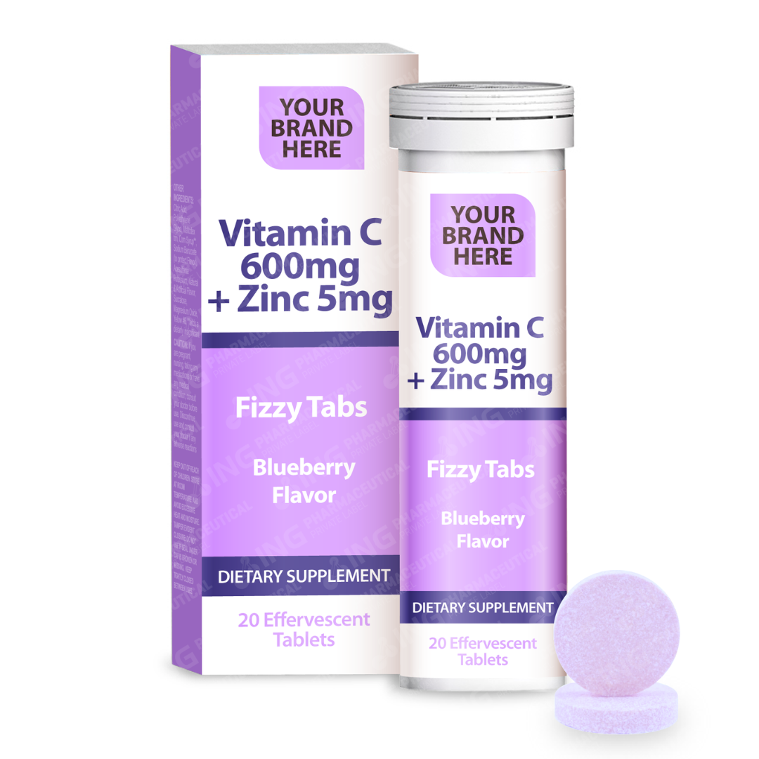 Vitamin C 600 + Zinc 5mg Effervescent Tablets Private Label | Vitamin C 600mg + Zinc 5mg - Blueberry Flavor - Immune Support | Private Label Fizzy Tablets Manufacturer